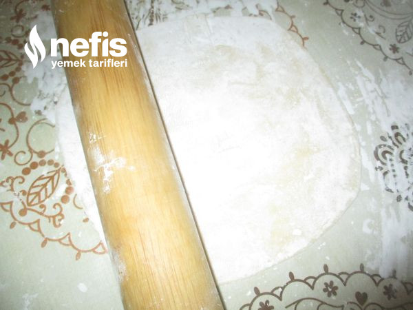 - Sonra hamurları ince olacak halde büyükçe bir hamur olacak halde oklavayla nişasta serperek açalım.