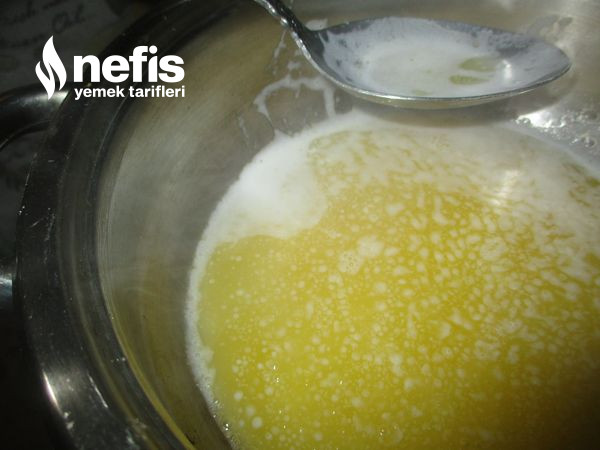 - Tereyağı kısık ateşte eritelim üzerine çıkan köpükleri kaşık ile alalım ,sıvı yağ katıp karıştıralım.