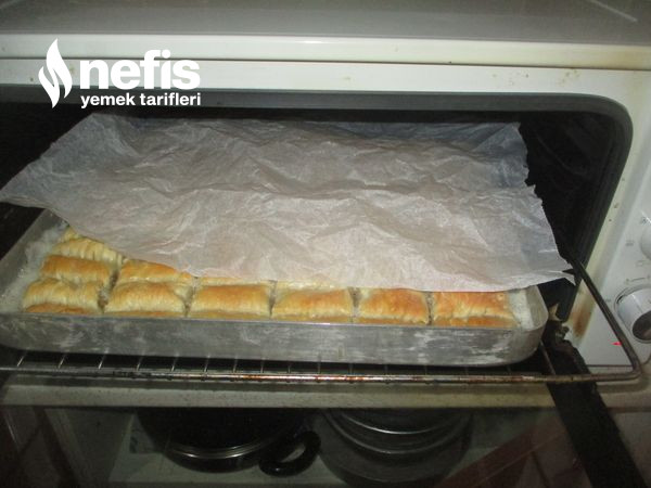 - Biraz katlayalım, iki yemek kaşığı cevizi sıra halde dökelim, rulo formunda saralım, büzdürerek oklavayı çıkaralım, yağlanmış fırın tepsisine hepsini bu halde dizelim.