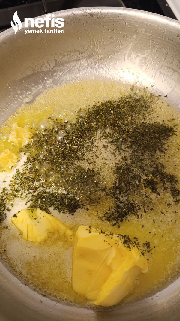 - Aynı tencereye tereyağı alıp eritiyoruz. Üzerine kurur naneyi ekleyerek karıştırıyoruz.