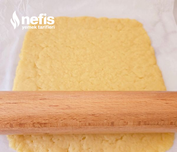 3. Hamuru toparlayıp pişirme kağıdına alın merdaneyle yarım cm kalınlığında açın kenarlarını kesme aparatıyla düzelterek kare formu verin.