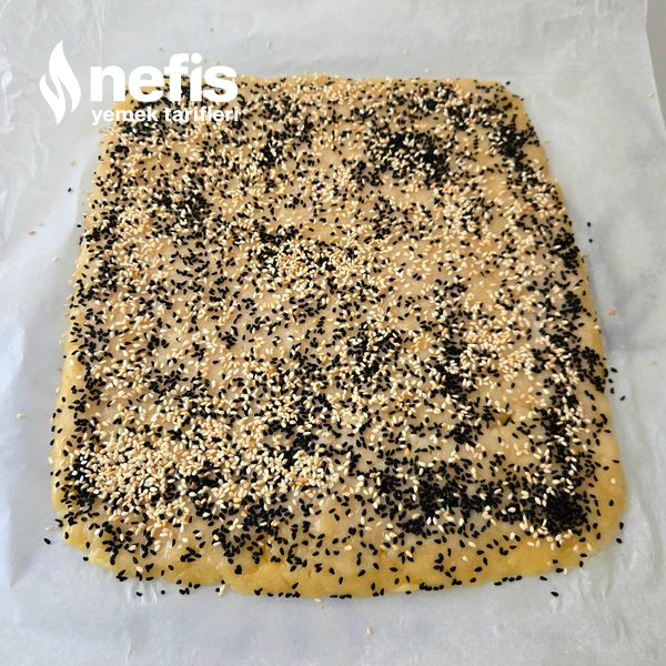 5. Üzerine yumurta akını sürün ,çörekotu ve susam seriştirin, çubuklar halinde kesin ,kesme aparatıyla ortalarını yarım cm açıp boşluk bırakın.