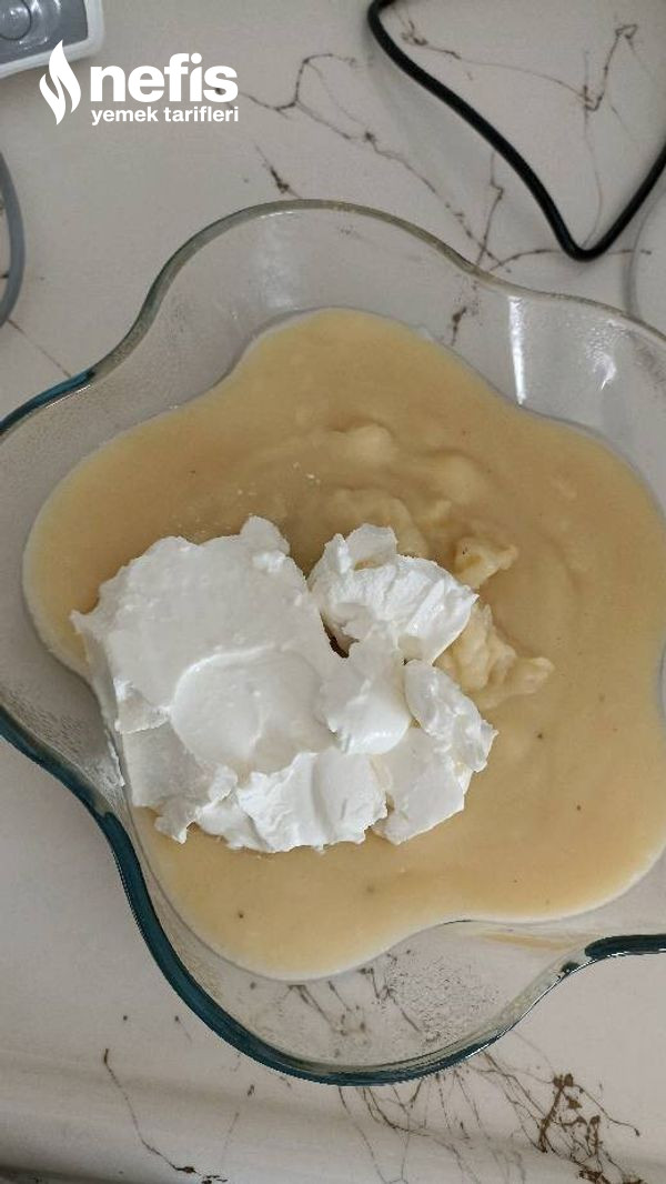 - Pişen muhallebinin üzeri streç sinema ile kapatılır ve soğuduktan sonra labne peynir eklenir.