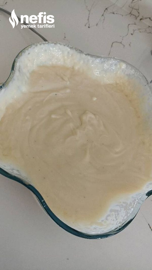 - Topak kalmayacak halde çırpılan muhallebi kekin üzerine dökülür.
