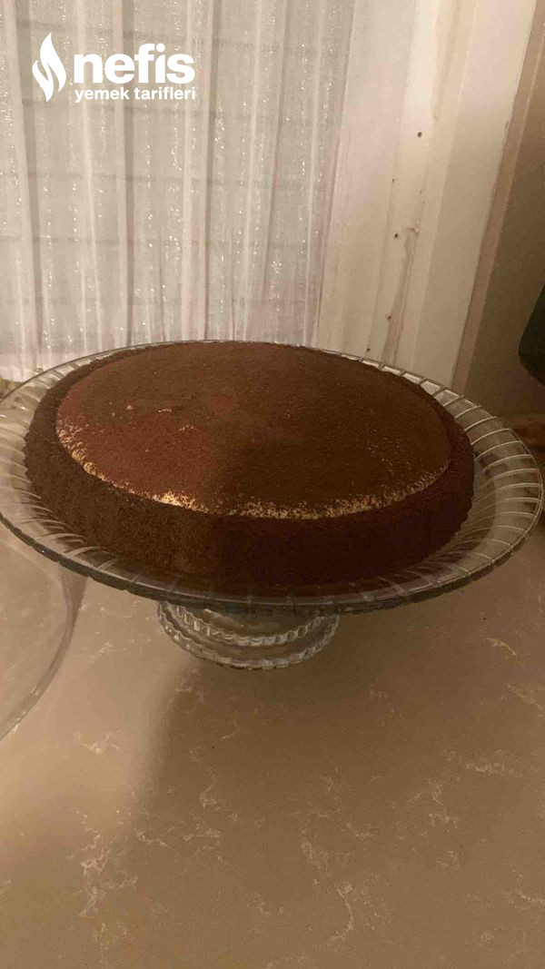 7. Montaj için; soğuyan keki aksi çevirin. Nescafeli karışımı kekin ortasına ve kenarlarına kaşıkla gezdirerek güzelce ıslatın.  Hazırladığınız kremayı kekin ortasına dökün.