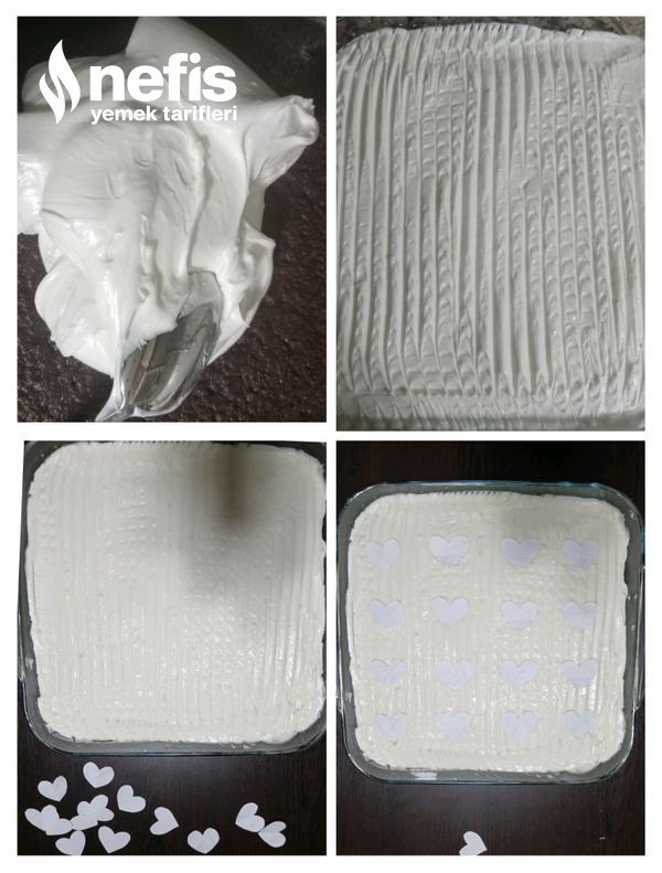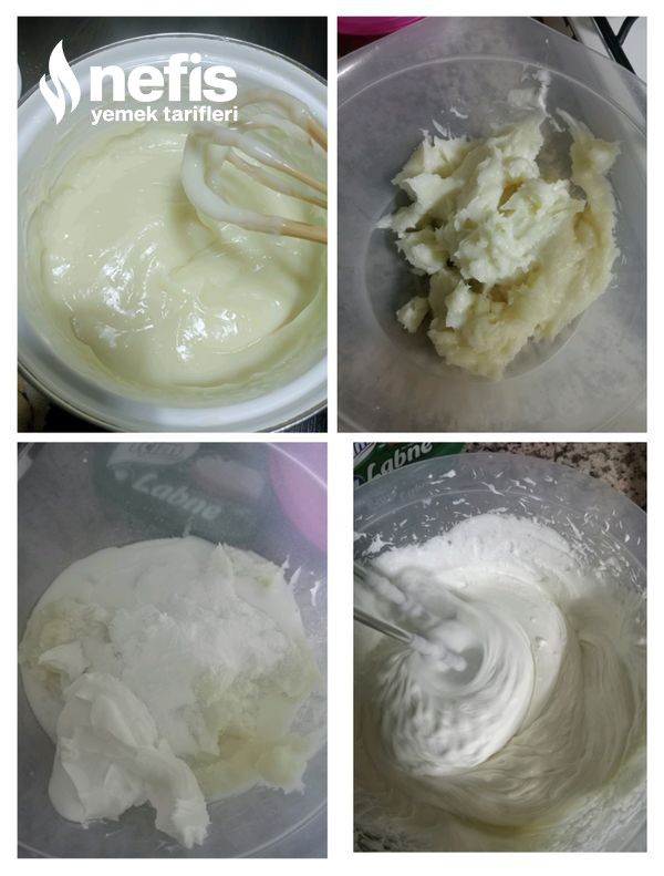 15. Soğuyan kremanın üzerine 1 poşet krem şanti, 1 çay bardağı süt ve tepeleme bir yemek kaşığı labne eklenip 4-5 dk çırpılır.
