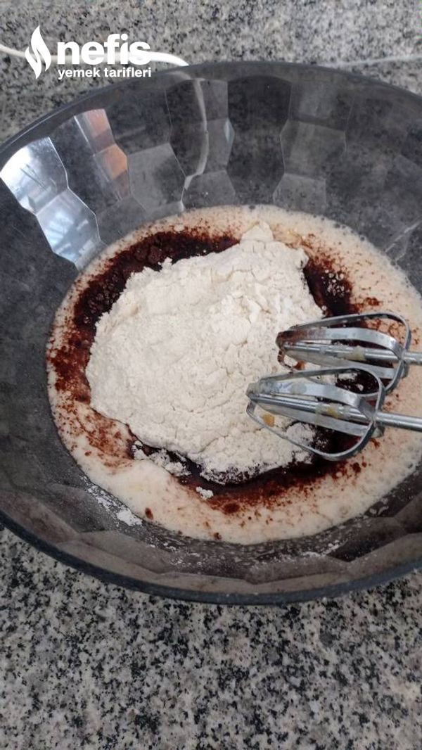 - Daha sonra iki yemek kaşığı kakao, iki çay bardağı un, bir paket kabartma tozu ve bir paket vanilya ekleyerek materyaller karışıncaya kadar çırpmaya devam edelim.