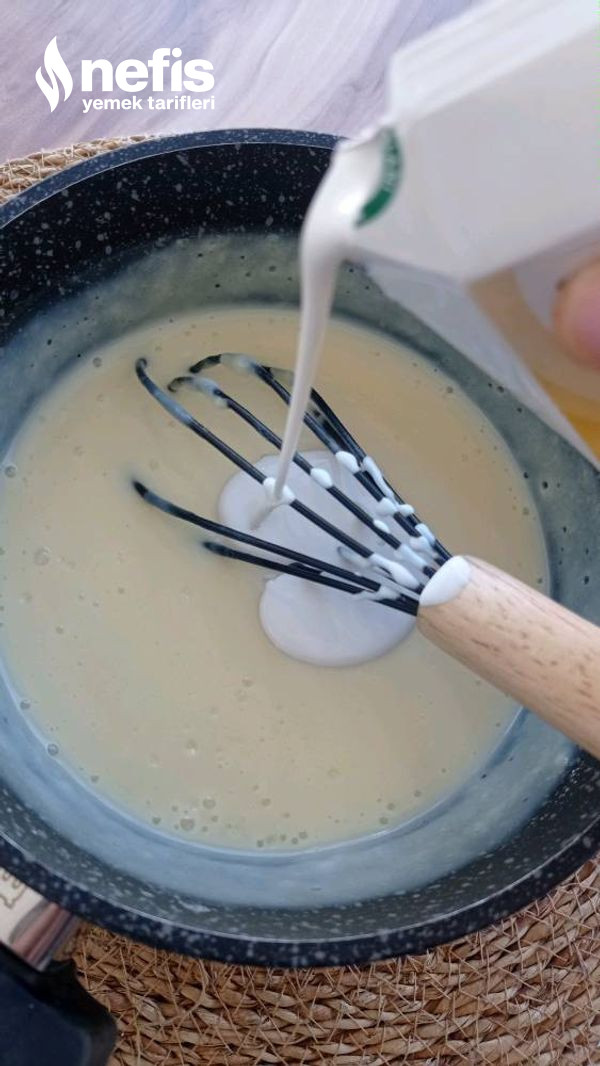 - Bunun için tencereye bir adet yumurta sarısını, bir çay bardağı toz şekeri, tepeleme iki yemek kaşığı unu ve 2 su bardağı sütü alalım.