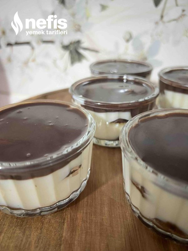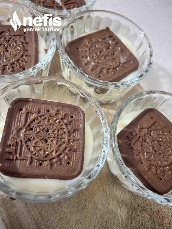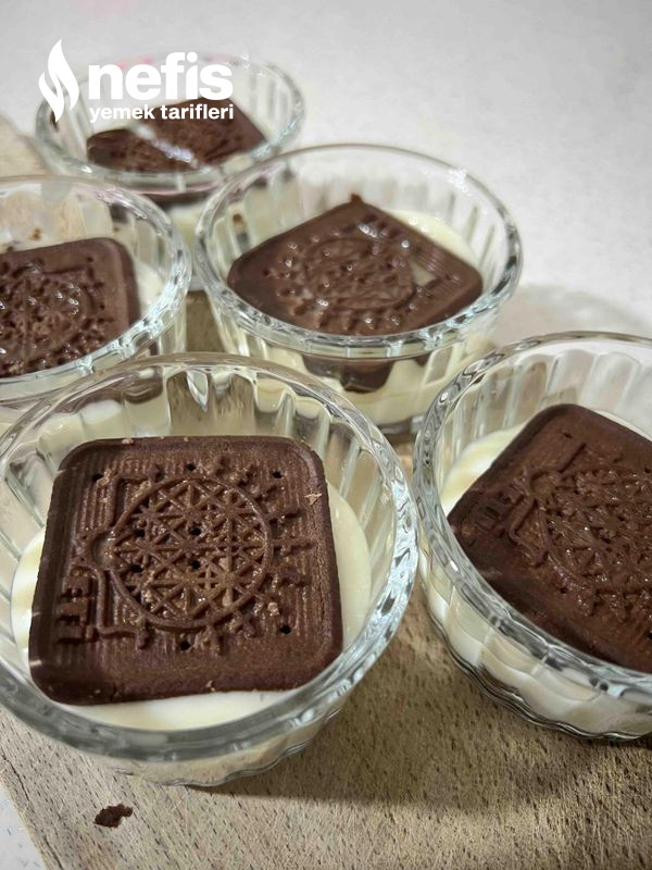 5. Kabın altına evvel bisküvi sonra muhallebili sonra yeniden bisküvileri ekleyip üzerine çikolata sosunu döküp soğumaya bırakalım.