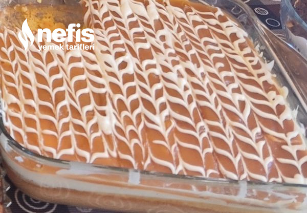 5. Krem şantimizi sütle hazırlayalım ben yarım paket krem şantili göz kararı süt ile açtım. Kekin üstüne krem şantiyi dökelim ve yayalım. Daha sonra soğuyan karamelimizi dökelim ve yayalım.
