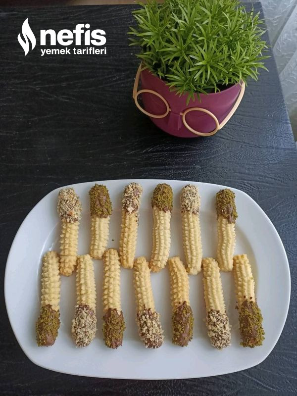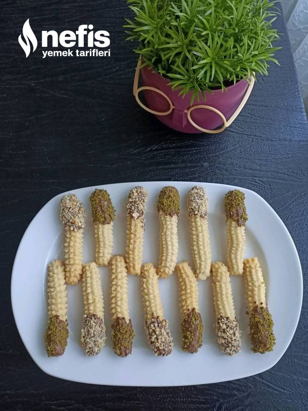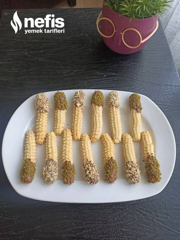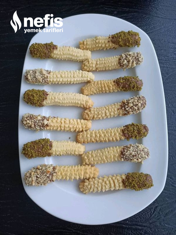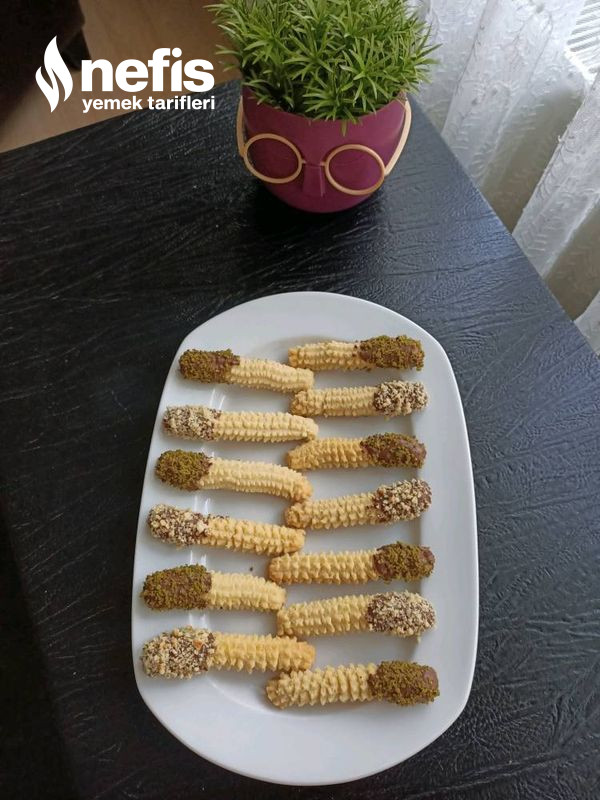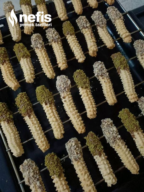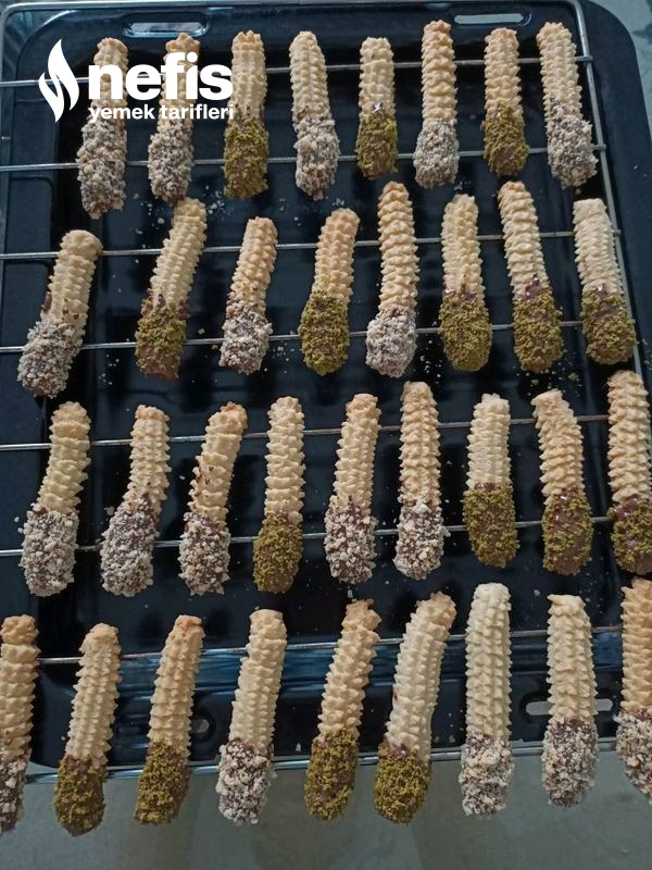 - Önceden ısıtılmış 180 derece fırında altı-üstü pembeleşinceye kadar pişirin, soğuyan kurabiyelerin üç kısmını benmari metodu eritilmiş çikolataya batırın.