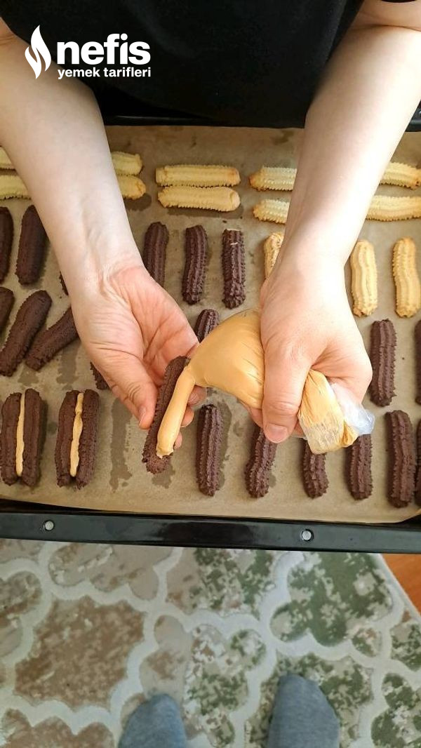 5. Tırtıl kurabiye aparatıyla yağlı kağıda kurabiyeleri sıkıp, 160 derece ısıtılmış fırında hafif pembeleşinceye kadar pişirelim.