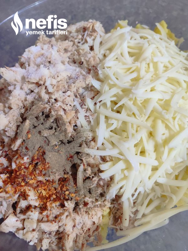 - Tavuk, patates, kaşar ve baharatları karıştırma kabına alıp elimizle güzelce yoğuralım.