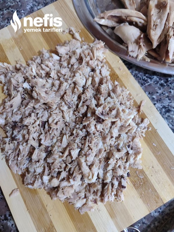 - Baget için tavukları haşlıyoruz ve derisini ve kemiğinden ayırıp bıçak ile ince ince doğruyoruz. Kemikleri de güzelce temizleyelim.