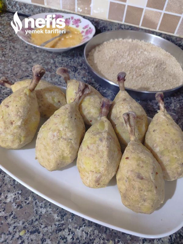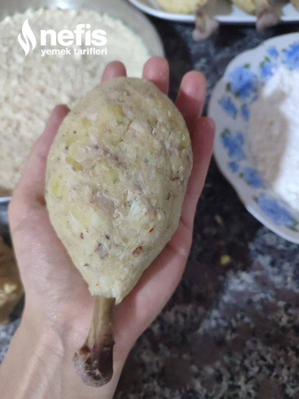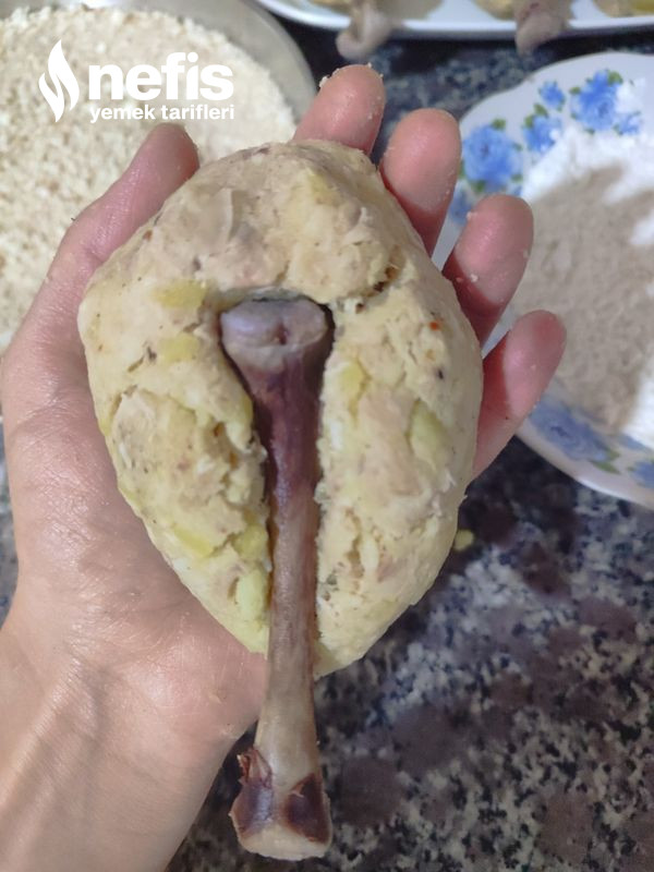 - 8 eşit modüle ayırdığımız baget hamurlarından birini alalım elimizle yuvarlak biçim verelim ve temizlediğimiz kemiklerden birini alıp fotoğraftaki üzere hamura yerleştirip tekrar elimizle yuvarlak hal verelim ve kemik hamurun içinde kalsın.