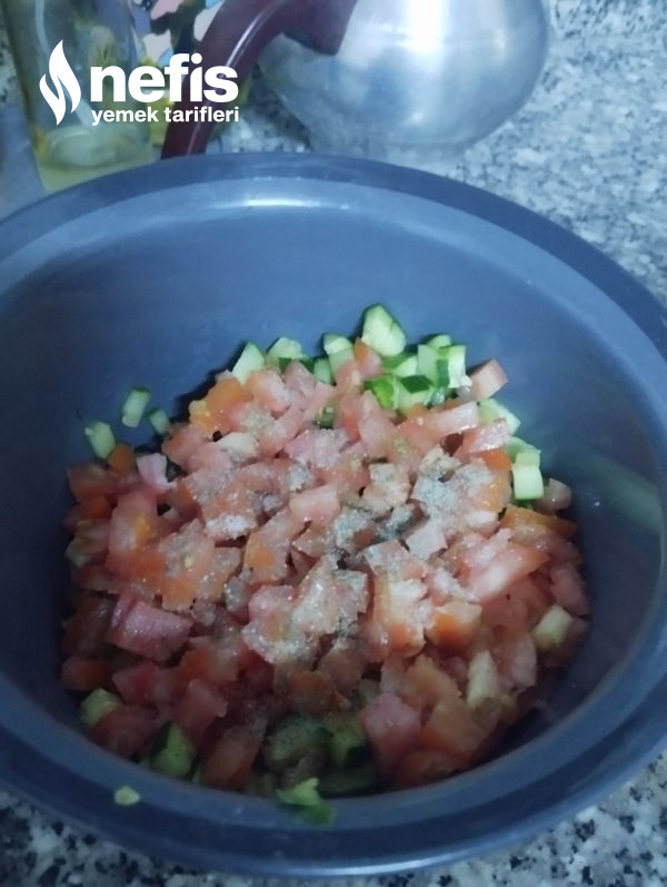 1. Domates, biber ve salatalığı çoban salata formunda doğrayalım.