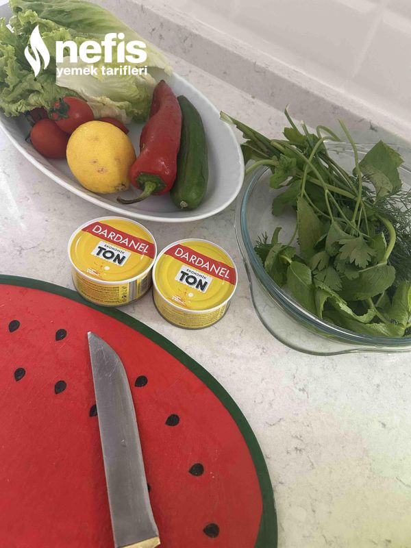 - Doğradığımız yeşillikleri farklı bir kapta karıştıralım, salata kasesine alalım üzerine salatalık, domates, kapya biber ve yağını süzdüğümüz ton balığını yayarak koyalım.