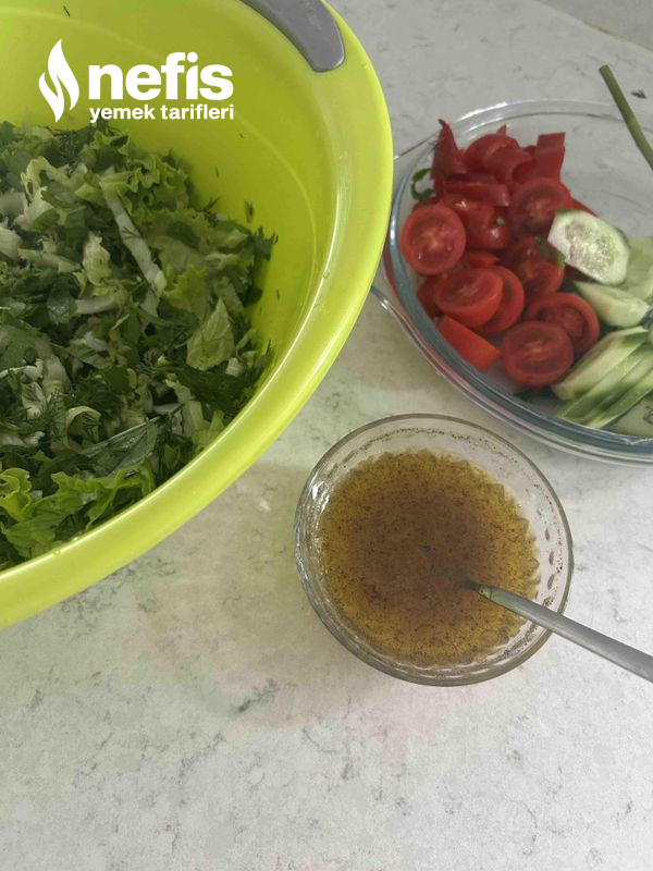 - Yeşillikleri istediğimiz formu ile doğrayalım, salatalığı alacalı soyalım verev biçimde keselim kapya biberi halka halka doğrayalım çeri domatesleri ortadan keselim sos materyallerini çukur bir kaseye alalım güzelce karıştıralım.