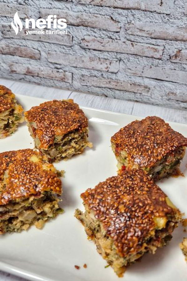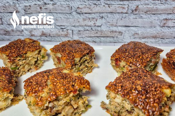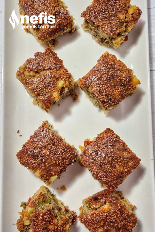 1. Öncelikle yumurta ve baharatlar çırpılır. Daha sonra sıvıyağ ve yoğurt eklenir karıştırılır. Kalan başka gereçlerde katılıp karıştırılır. Yağlanan tepsiye dökülür ve ayrılan yumurta sarısı üzerine fırça yardımı ile sürülür susam serpilir.