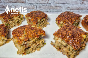 1. Öncelikle yumurta ve baharatlar çırpılır. Daha sonra sıvıyağ ve yoğurt eklenir karıştırılır. Kalan başka gereçlerde katılıp karıştırılır. Yağlanan tepsiye dökülür ve ayrılan yumurta sarısı üzerine fırça yardımı ile sürülür susam serpilir.