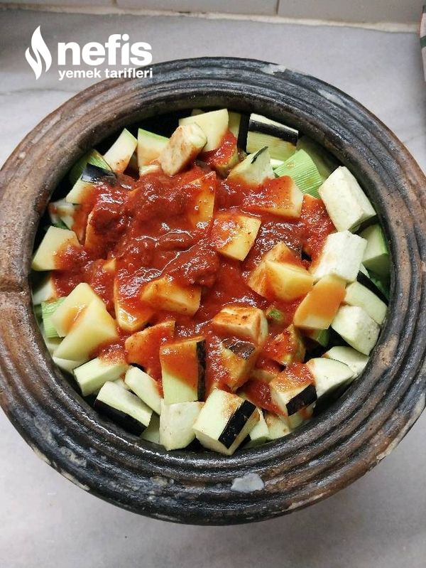 - Toprak tencere ye birinci evvel küp küp doğradığımız soğanları koyalım, üzerine etlerimizi ve sırasıyla küp küp doğradığımız patatesi ,patlıcan, kabakları koyalım ve ortasına tereyağını bırakalım.