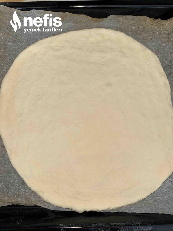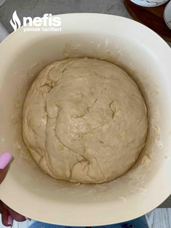 4. Mayalanan hamuru 2 eşit kesime ayırın. Unlanmış tezgahta elinizle açın.