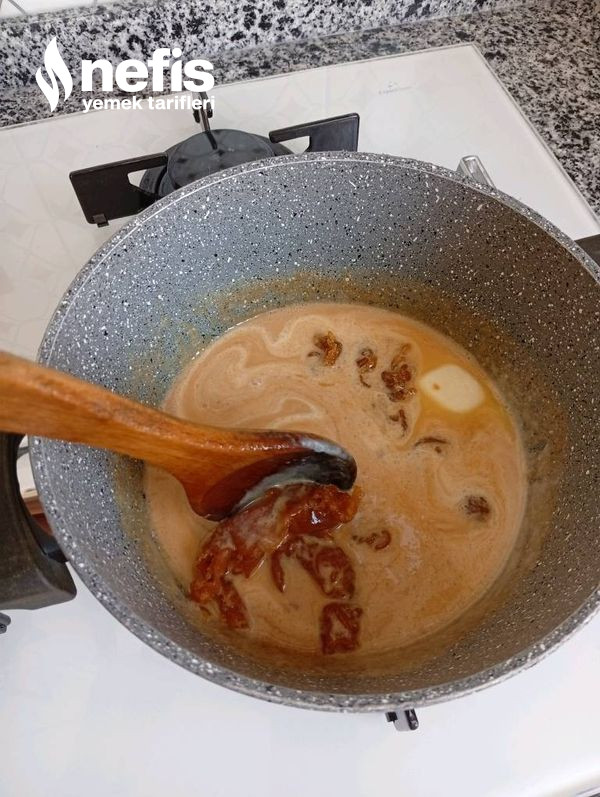 - Eriyen şekere sıvı krema ve 1 kaşık tereyağı ekleyip karıştıralım şeker sertleşebilir ısıyla eriyecektir.