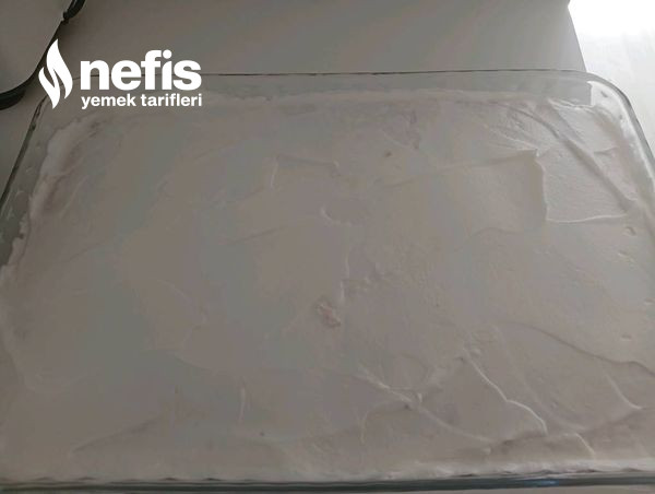- Soğuyan keki bilakis çevirip sıvı kremalı şerbeti dökelim üzerine çırptığmız kıremşantiyi sürüp ince şerit çizgiler için biraz kremşantiden ayırabilsiniz dilerseniz hazır beyaz çikolata sosuda kullanabilirsiniz ben kremşantiyle yaptım.