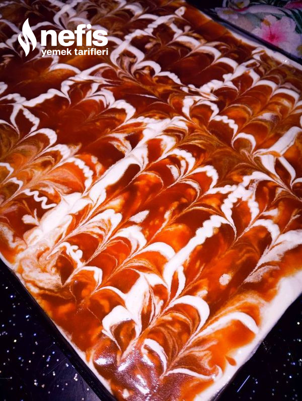 - Krem şantiyi üzerine sürelim ve yeterlice soğumuş krameli üzerine dökelim, bir kaşık krem şantiyi ayıralım, üzerine biçim yapmak için en az 6 saat dolapta dinlenmesi gerekir.