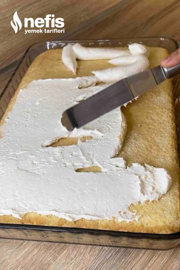 - Krem şanteyi şerbetini çeken kekin üzerine düz bir halde yayalım.