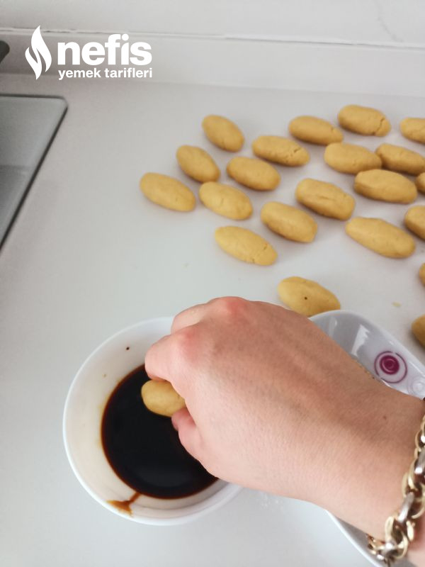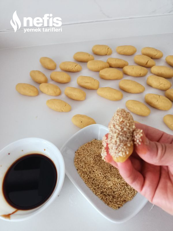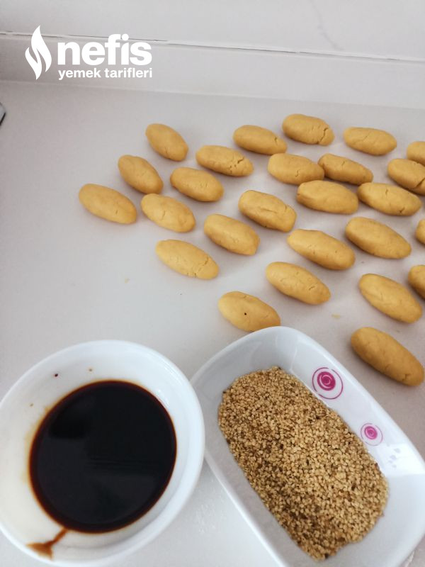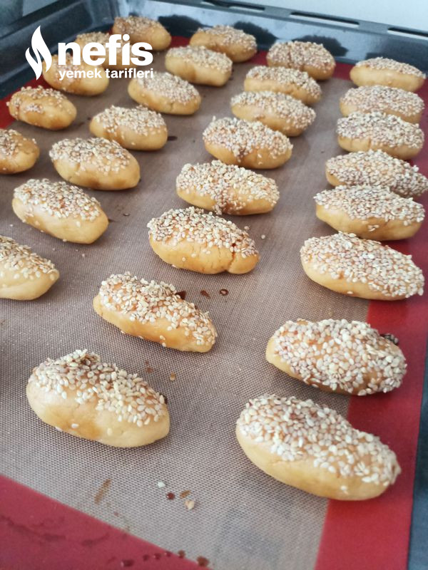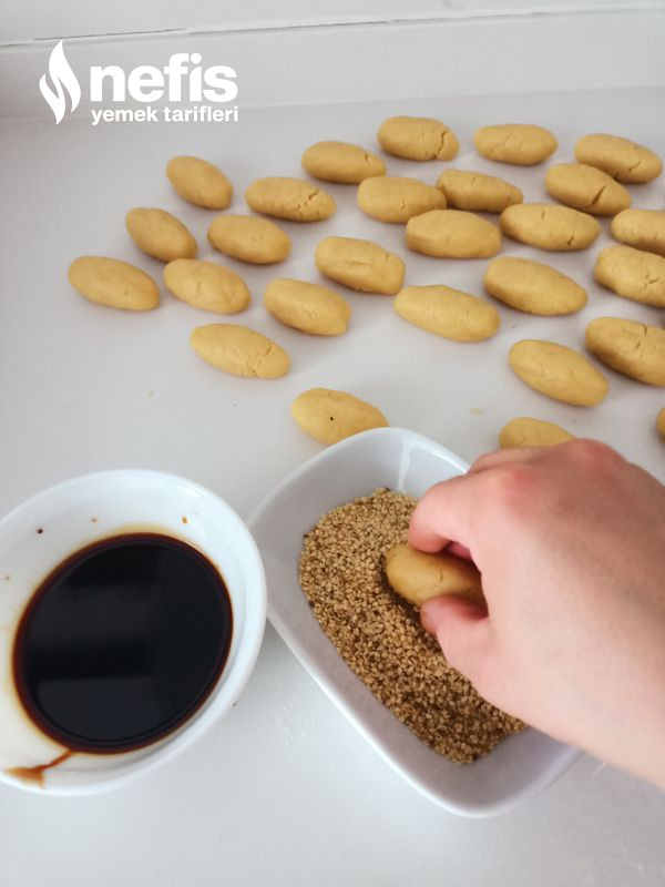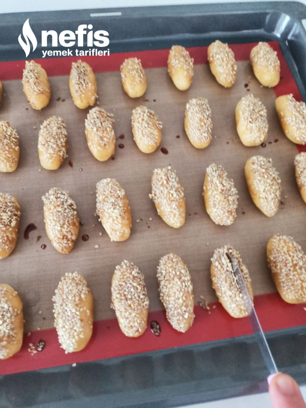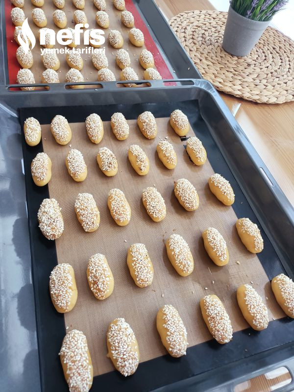 - Şekil verdiğimiz kurabiyeleri evvel pekmezli su sonra susama bulayıp fırın tepsisine alıyoruz.