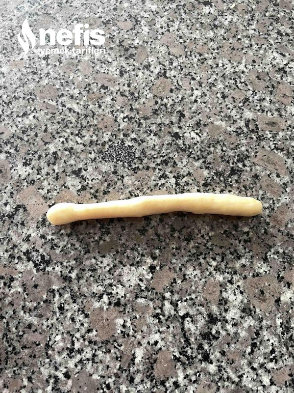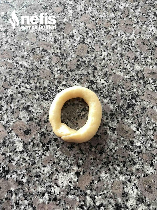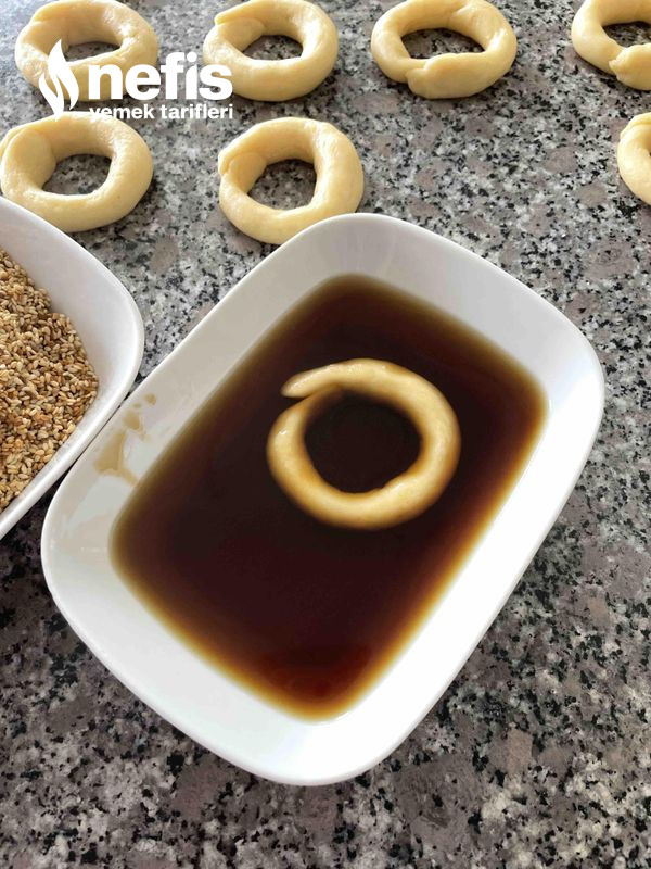 3. Ayrı bir kapta pekmez ve suyu karıştıralım, hamurumuzdan ceviz büyüklüğünde modüller alıp uzunlamasına inceltelim daha sonra uçlarını birleştirip daire formu verelim.