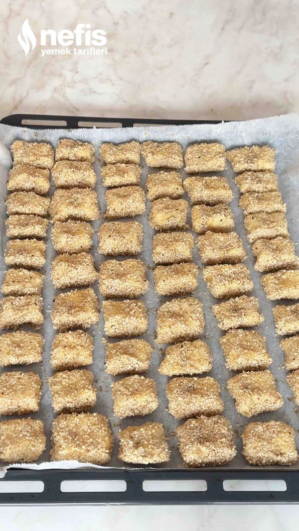 - Hazırladığımız kurabiye toplarını birinci evvel pekmezli suya sonra susama batırıyoruz .