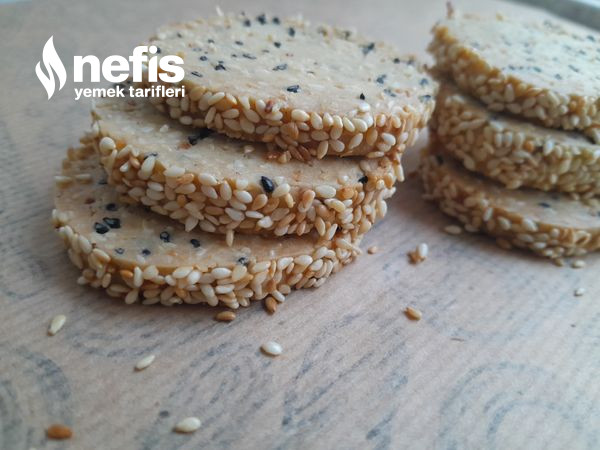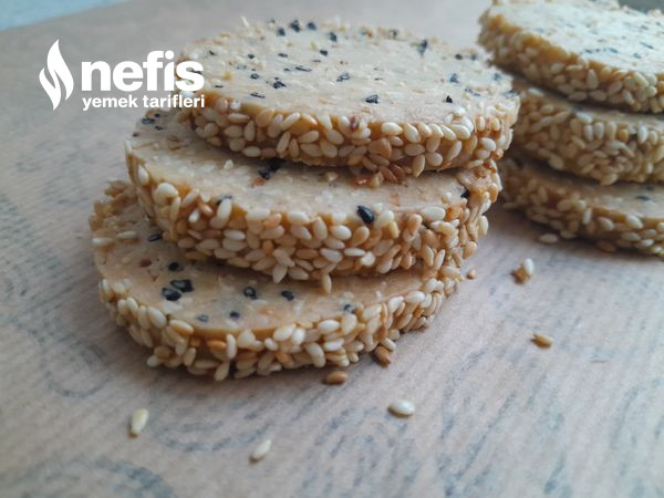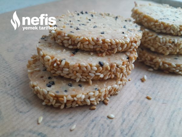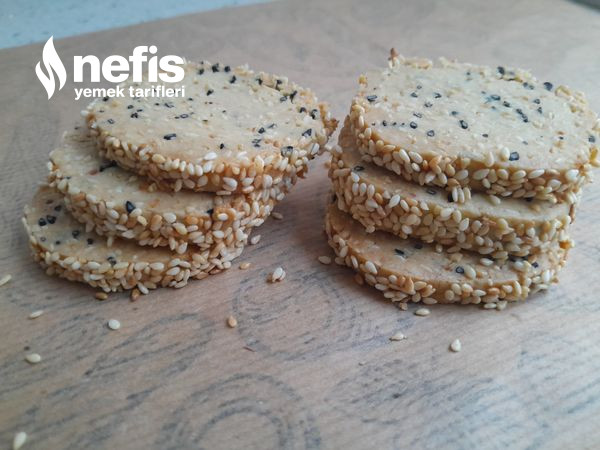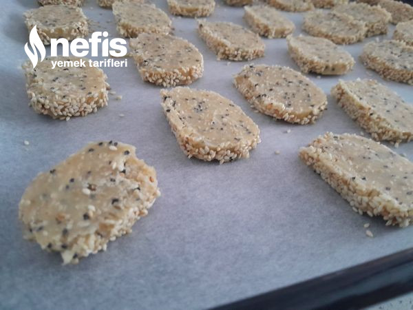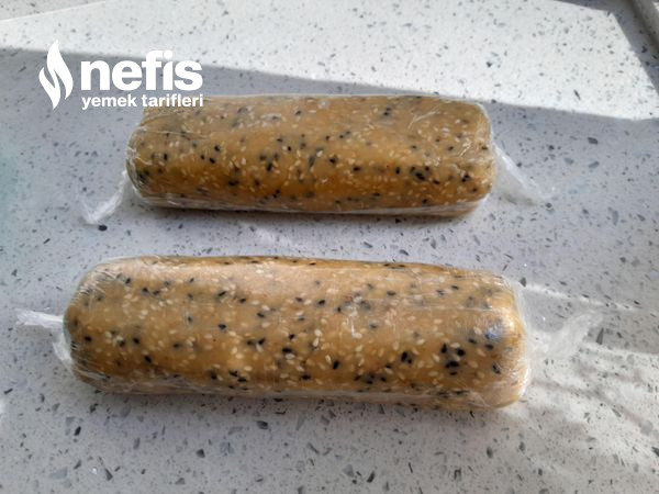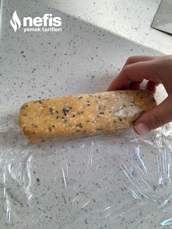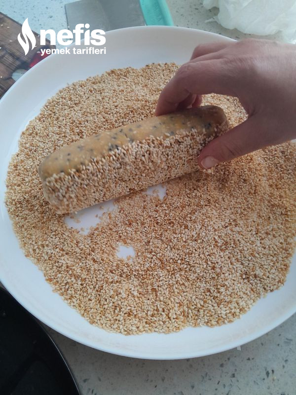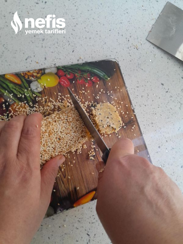 4. Donmuş kurabiyeyi evvel yumurta akı olan suya ,sonra susama bulayıp dilim dilim keselim, yağlı kağıt serilmiş fırın tepsisine dizelim .