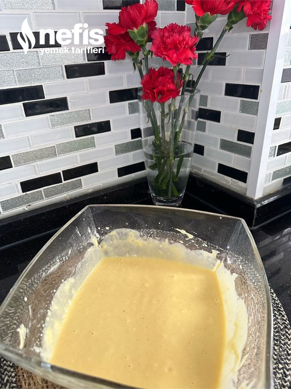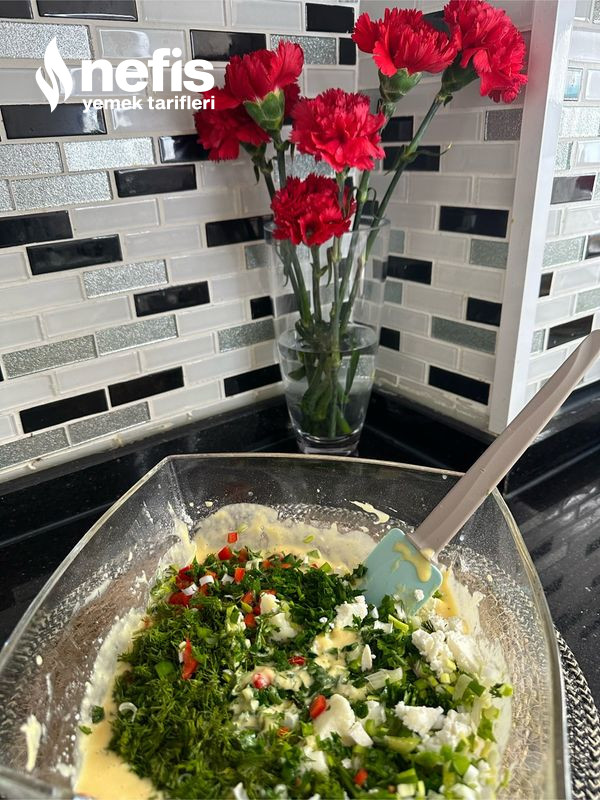 - Üzerine baharatlar, un ve mısır unu eklenerek karıştırılır. Kabartma tozu da eklenerek ince doğranmış sebzeler eklenir ve kaşık yardımıyla homojen karışım elde edilir.