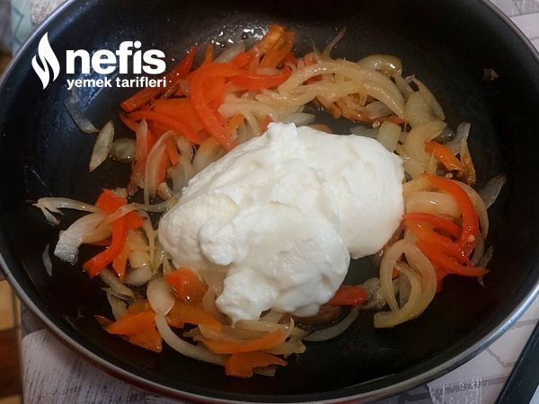 4. Yoğurdu ek edelim süratli halde karıştıralım. 1-2 dakika kadar kaşık yardımı ile karıştıralım.