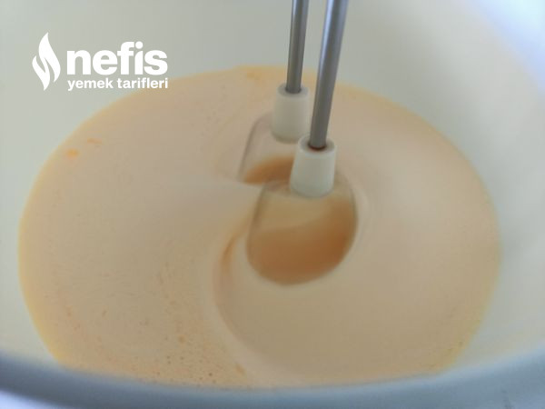 1. Yumurta ve toz şekeri 5 dakika kadar uygunca köpürene kadar çırpalım, başka tarafta una kuru materyalleri koyup karıştıralım, uygunca köpüren yumurta ve şekere sırayla sıvı yağı süt koyup çırpmaya devam edelim.