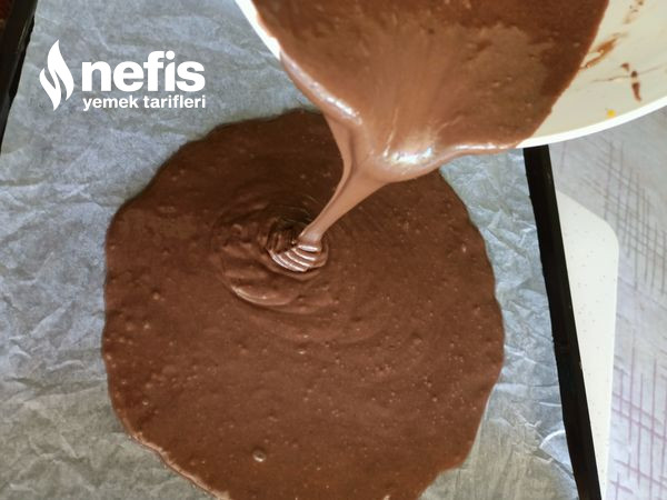 3. Fırın tepsimize yağlı kağıdı serelim kek harcımızı üzerine dökelim, fırın tepsimizi birkaç defa yere vurup içindeki hava kabarcıklarını giderelim.
