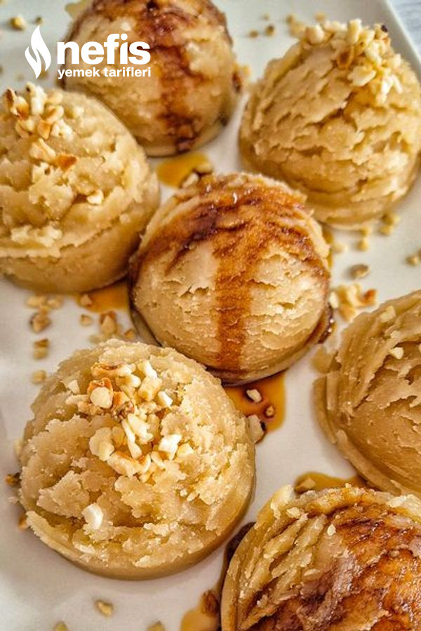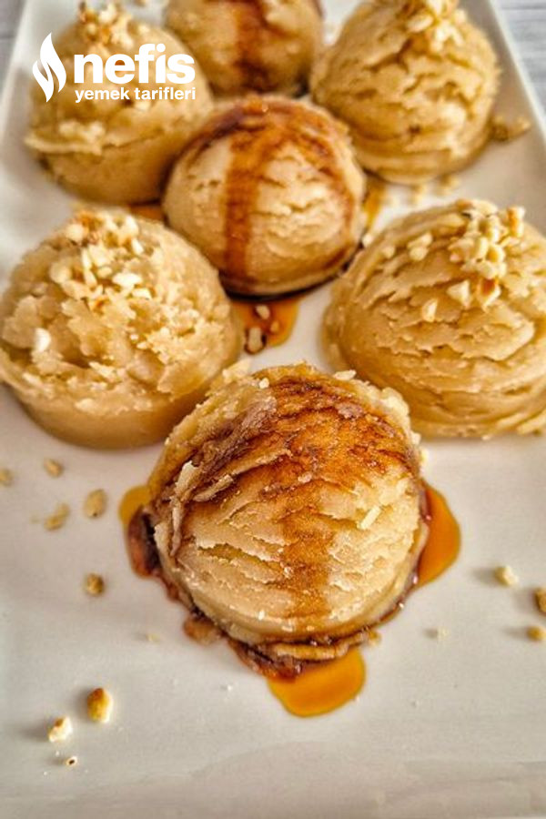 - Bir dondurma kaşığı ıslatılarak form verilir ve üzerine hurma özü,fındık fıstık vs serpilerek ılık olarak servis edilir.