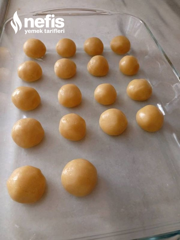 - Hamurdan ceviz büyüklüğünde kesimler alınıp yuvarlak haller verilir.