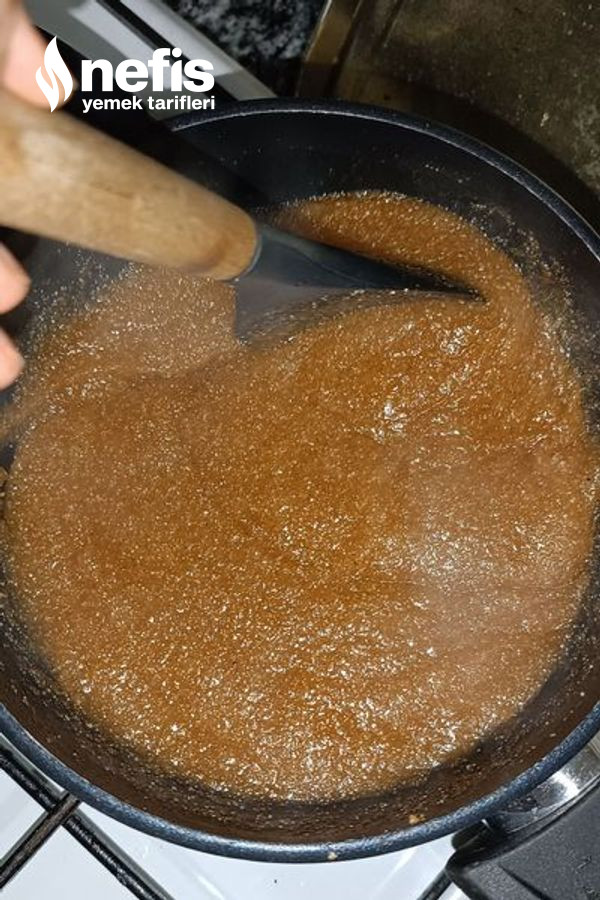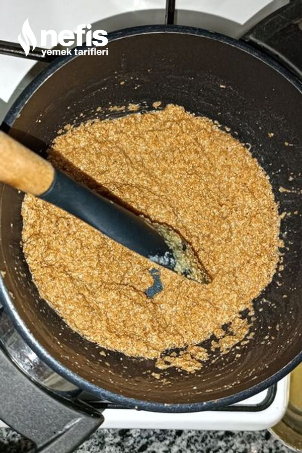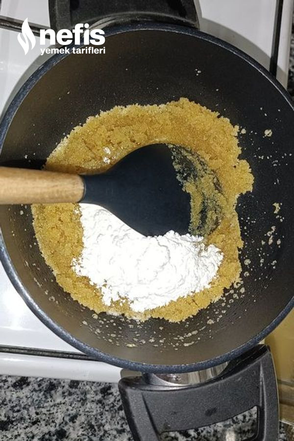 - Yağı kızdırmadan içine irmik ve unu ekleyip orta ateşte 10 dk kavurmalı rengi görselde ki üzere olunca bir kenara aldığımız şerbeti yavaş yavaş ekleyelim, orta ateşte karıştırmaya devam edelim.