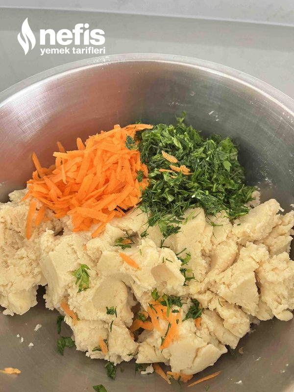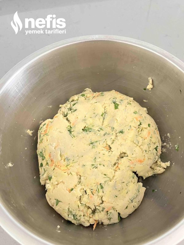 - Üzerine ince kıyılmış maydanoz, dereotu ve rendelenmiş havucumuzu ekleyip tekrar yoğuralım.