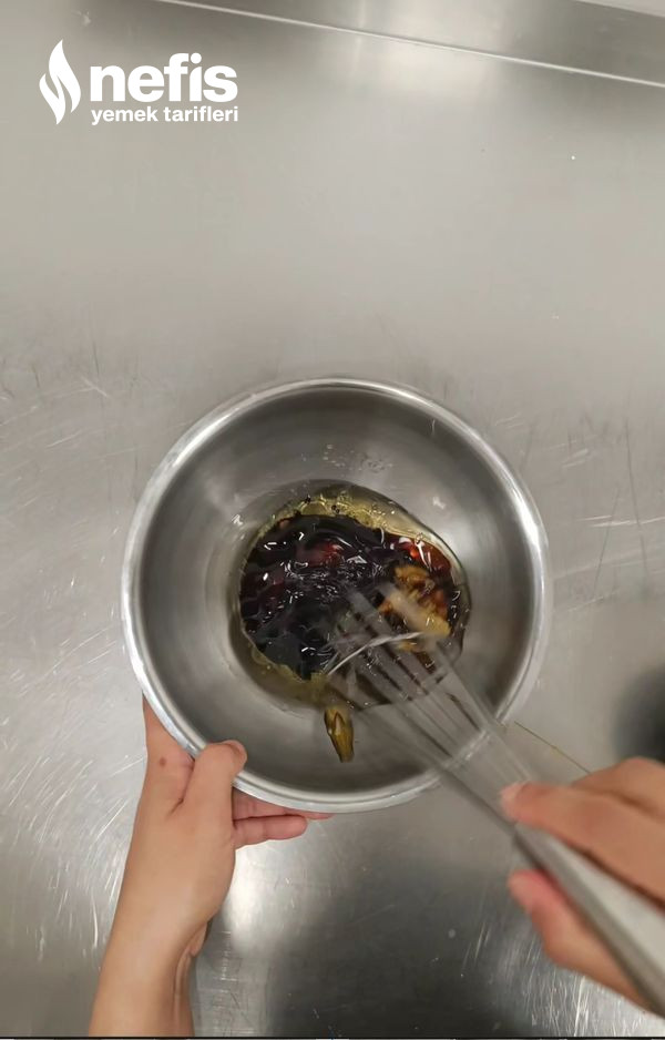 - Karıştırma kabına evvel zeytinyağı ,sirke ve balı ekleyip düzgünce çırpın.