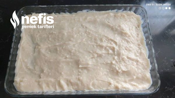 6. İlk sıcağı çıkan muhallebiyi kekin üzerine döküp yayalım.