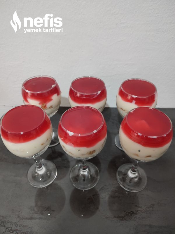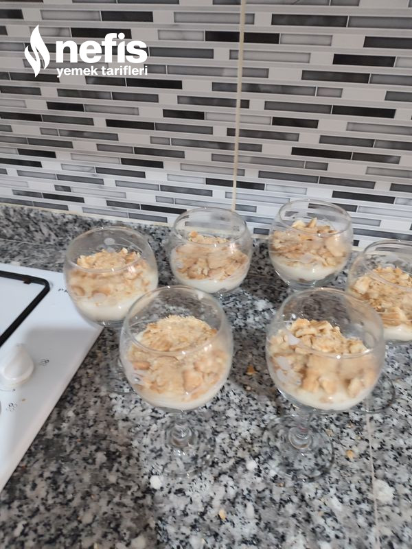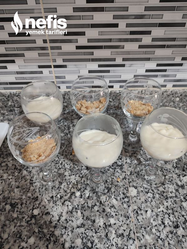 3. Pişen muhallebimizi bardaklara eşit bi biçimde dökelim bi bisküvi bi muhallebi yaptım ben.
