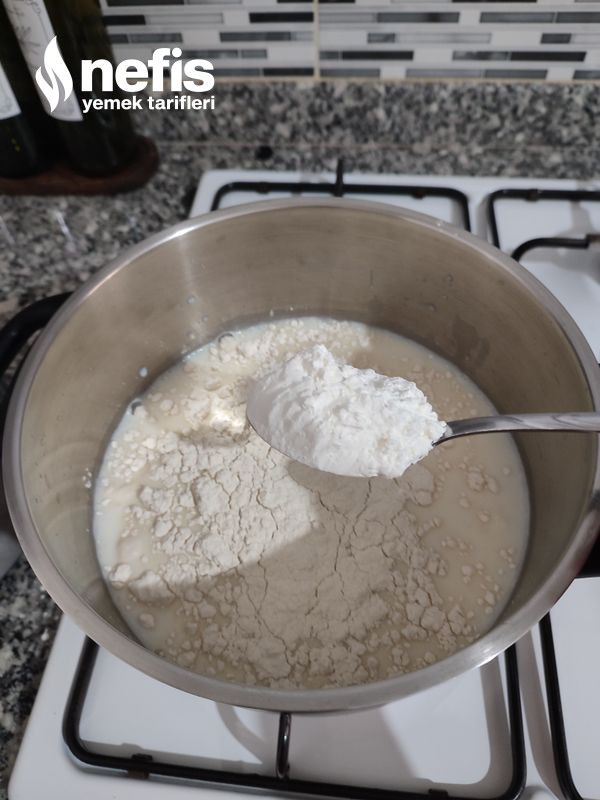 1. Süt, şeker, un ve nişastayı ocakta kaynamaya kadar karıştıralım ,kaynadıktan sonra margarin ve şekerli vanilinin ekleyelim ,margarin eriyen kadar karıştıralım.