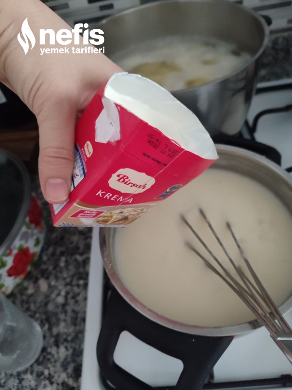 2. Kıvam alan muhallebimize bir kutu kremayı boşaltalım (ocaktan indikten sonra ) ve güzelce karıştıralım.