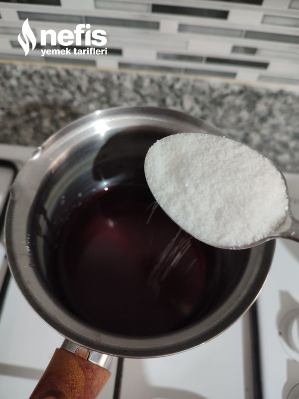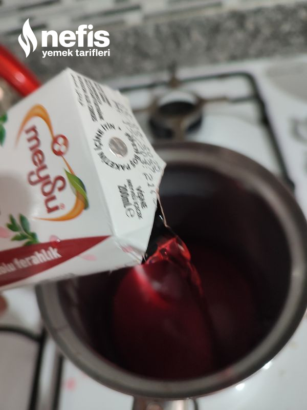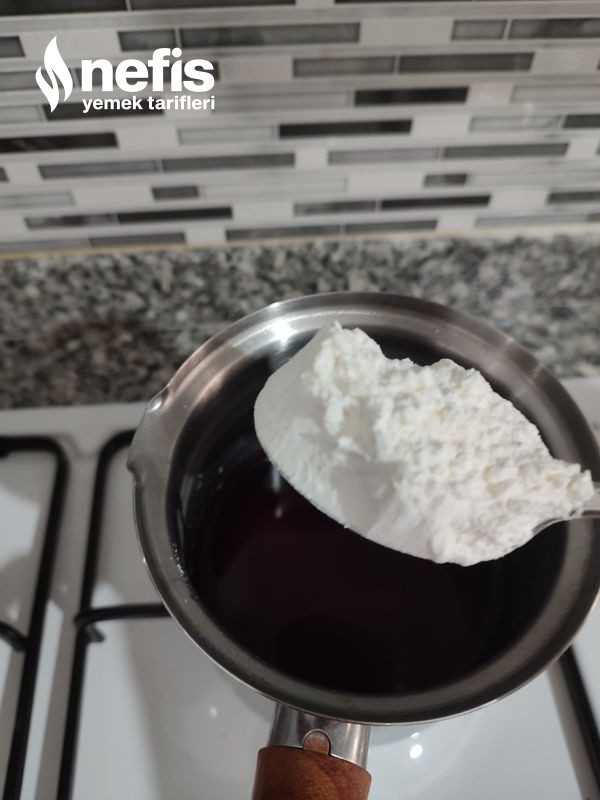 4. Üzeri için vişne suyuna şeker ve nişastayı ekleyelim ve kıvam alana kadar karıştıralım.