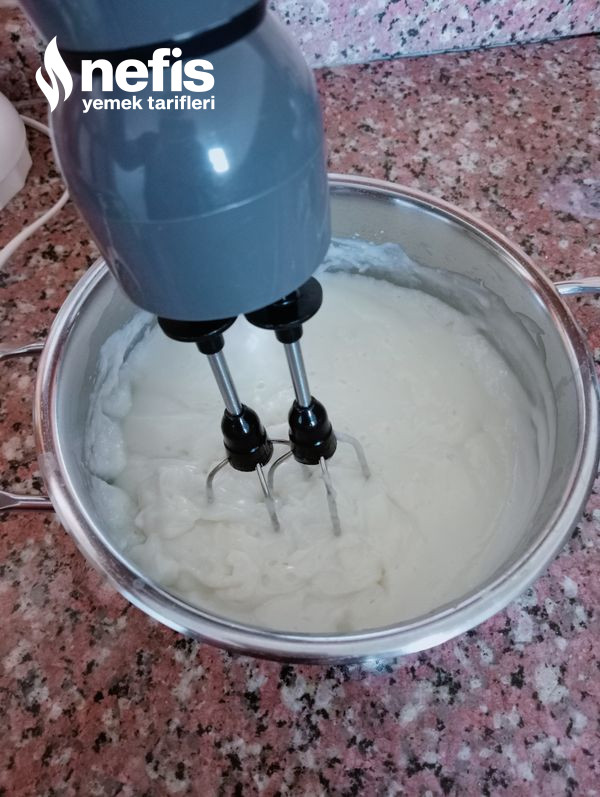 - Muhallebi soğuduktan sonra krem şantiyi koyup çırpıcı ile kıvam alana kadar çırpalım.