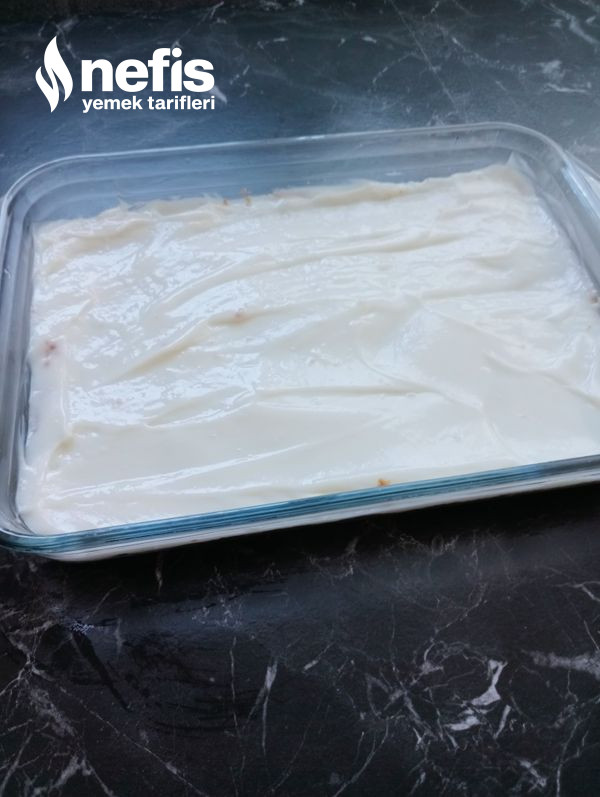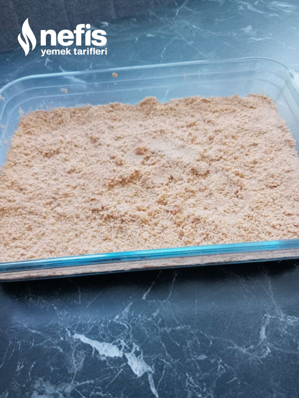 - Borcamın altını hafif ıslatıp bisküviyi dökelim, üzerine baskı uygulayarak düzeltelim.